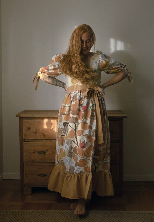 Transform your cherished textiles into a custom Florence dress, preserving the essence of your memories. From grandmother's curtains to childhood bed linens, entrust us with your fabric and breathe new life into them.
